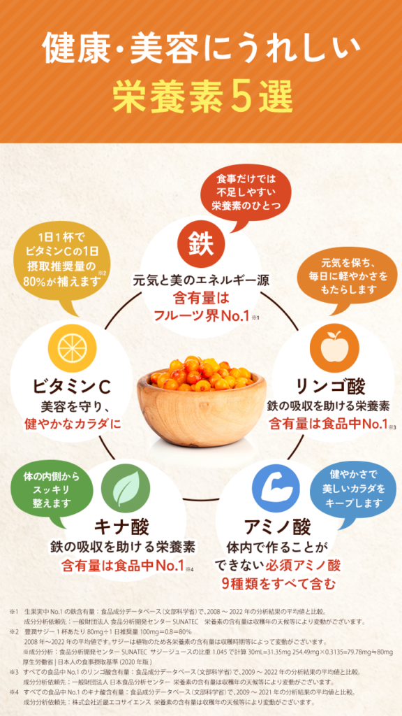 さらに、果実を裏ごしして仕上げる ピューレ製法で作られているサジージュースなら、果皮や果肉に含まれる栄養素も取り入れやすくなります。
