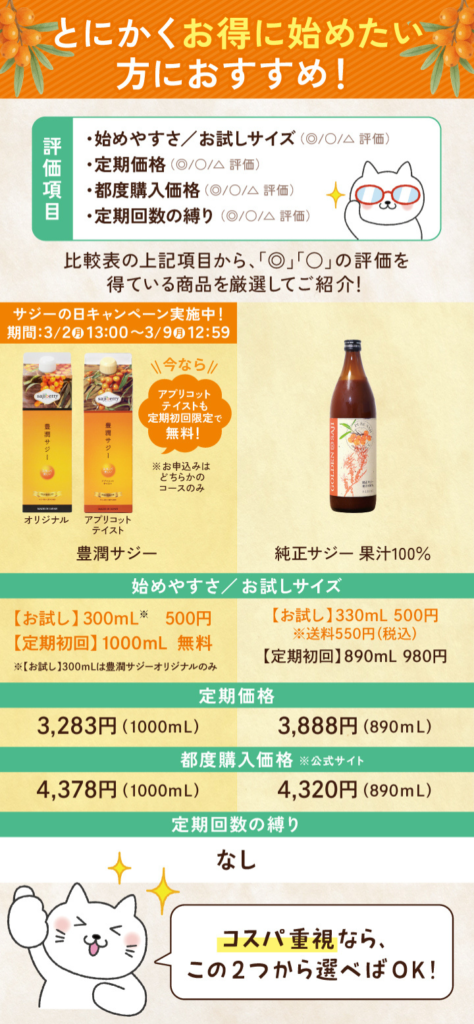 ※3:豊潤サジーを初めてご利用の方限定(同一世帯一回限り)/本キャンペーンは「オリジナルコース」または「アプリコットコース」のいずれか一方のみお申し込みいただけます。重複してのお申し込みは承れませんので、あらかじめご了承ください